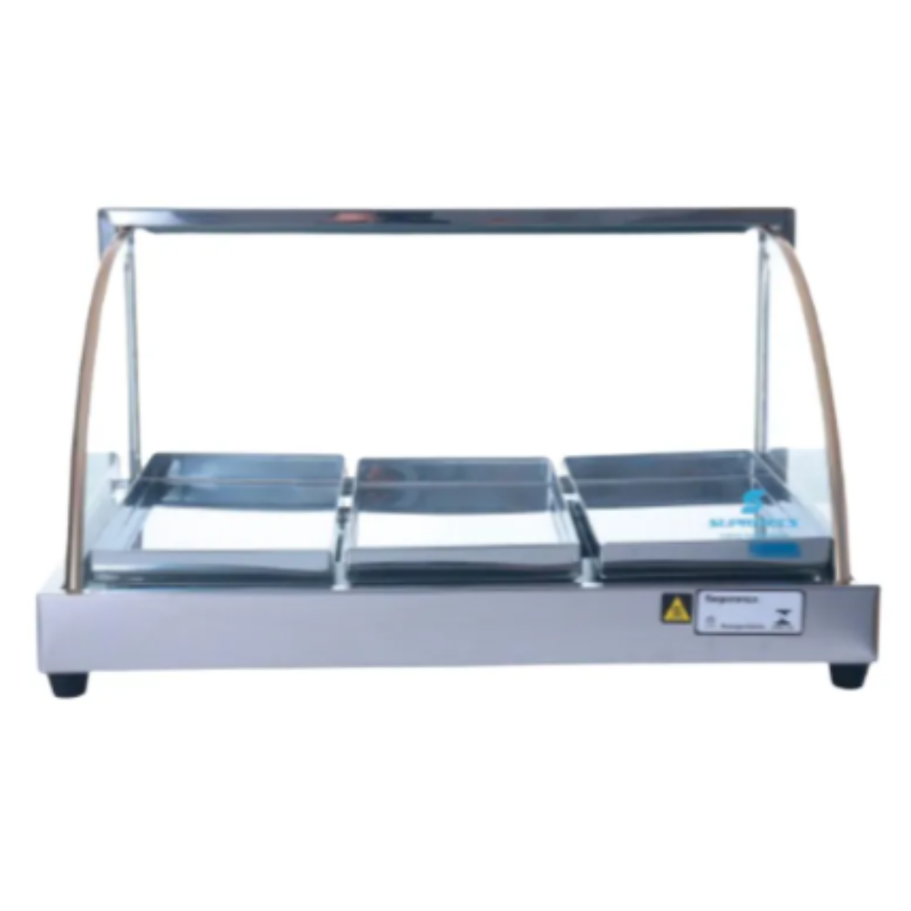 Capacidade ampliada: Com 3 bandejas, oferece maior espaço para expor e aquecer mais produtos ao mesmo tempo.