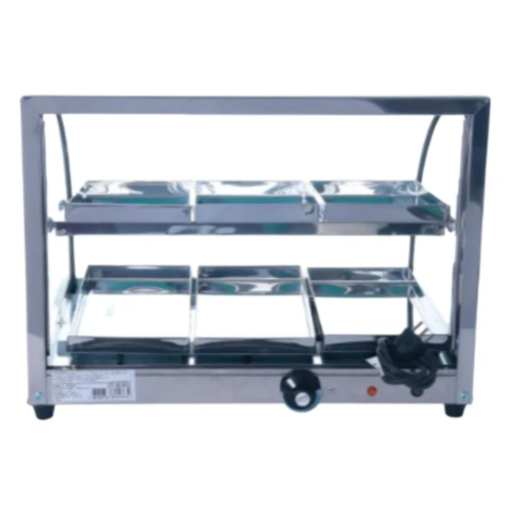 Alta capacidade de exposição: Com 6 bandejas em dois níveis, permite aquecer e exibir grande variedade de produtos ao mesmo tempo.
