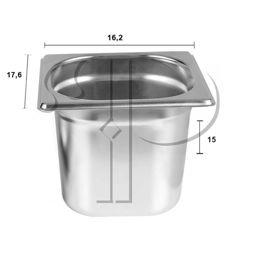 Cuba Gastronômica GN 1/6 x 150 mm (162 x 176 mm) 3 litros, produzida em Aço Inoxidável AISI 201, com 0,7 mm de espessura, especialmente desenvolvida para utilização gastronômica em Refrigeradores e Freezer, Rechauds, Buffet’s, Mesas Térmicas, Balcões Quentes ou Frios em restaurantes, bares, lanchonetes, cozinhas e refeitórios em geral.
