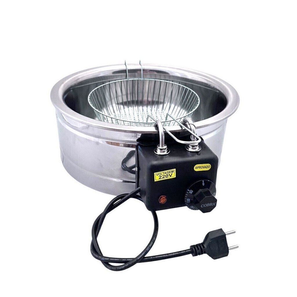 Tacho em Aço Inox Elétrico 8 Litros para Frituras Ipê Cozinhas 3 Benefícios para o Usuário: Praticidade no dia a dia: frituras rápidas e uniformes com regulagem precisa de temperatura. Facilidade na limpeza: cabeçote removível e materiais de inox que evitam acúmulo de resíduos. Durabilidade e segurança: resistência blindada, cesto estanhado e controle de temperatura de até 300°C. Características que Fazem a Diferença: Capacidade Total da Cuba: 8 litros (incluindo óleo e alimentos). Termostato Ajustável: de 50°C a 300°C, com regulagem precisa. Materiais de Alta Qualidade: aro, tacho e cabeçote em materiais resistentes que garantem maior durabilidade. Cesto Aramado Estanhado: fritura uniforme e prática. Cabeçote Removível: facilita a limpeza. Alça Funcional: projetada para melhor escorrimento do óleo. Instruções Rápidas de Uso: Ajuste a temperatura no termostato e acompanhe a luz piloto de aquecimento. Nunca ligue a fritadeira sem óleo. Evite temperaturas acima de 200°C, que podem queimar o óleo. Para medir a quantidade de óleo, utilize água como referência (sempre com a fritadeira desligada). Atenção: nunca misture água e óleo, e jamais ligue o equipamento com água. Especificações Técnicas: Capacidade da cuba: 8 litros (óleo + alimentos) Termostato ajustável: 50°C a 300°C Voltagem: 220V (1.600W) Dimensões: 14 cm (altura) x 32,5 cm (diâmetro) Uso: Comercial e residencial Tampa não inclusa Conteúdo da embalagem: 01 Aro inox 01 Cabeçote com resistência blindada 01 Cesto de fritura aramado 01 Tacho Aço inox 8 Litros 01 Manual de instruções